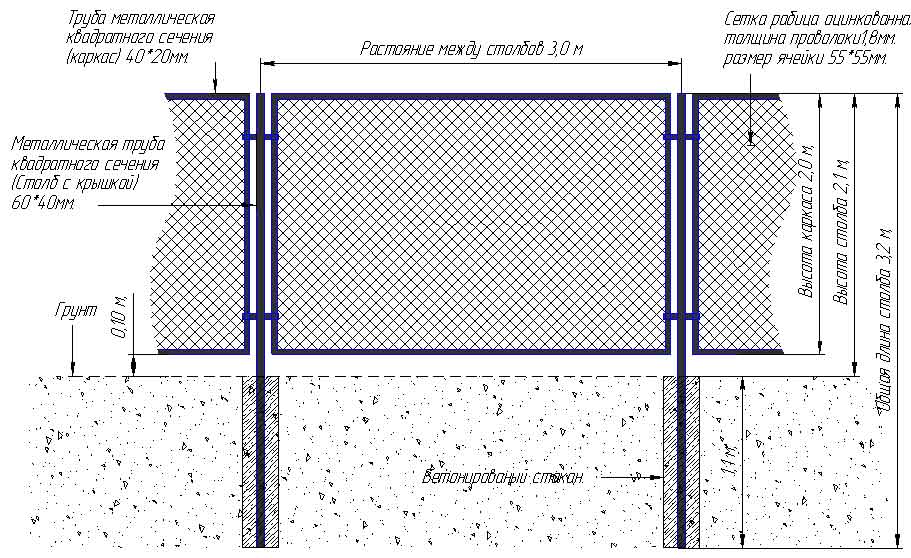- Для сетки высотой 2 м в большинстве случае столб должен быть длиной 3 м.