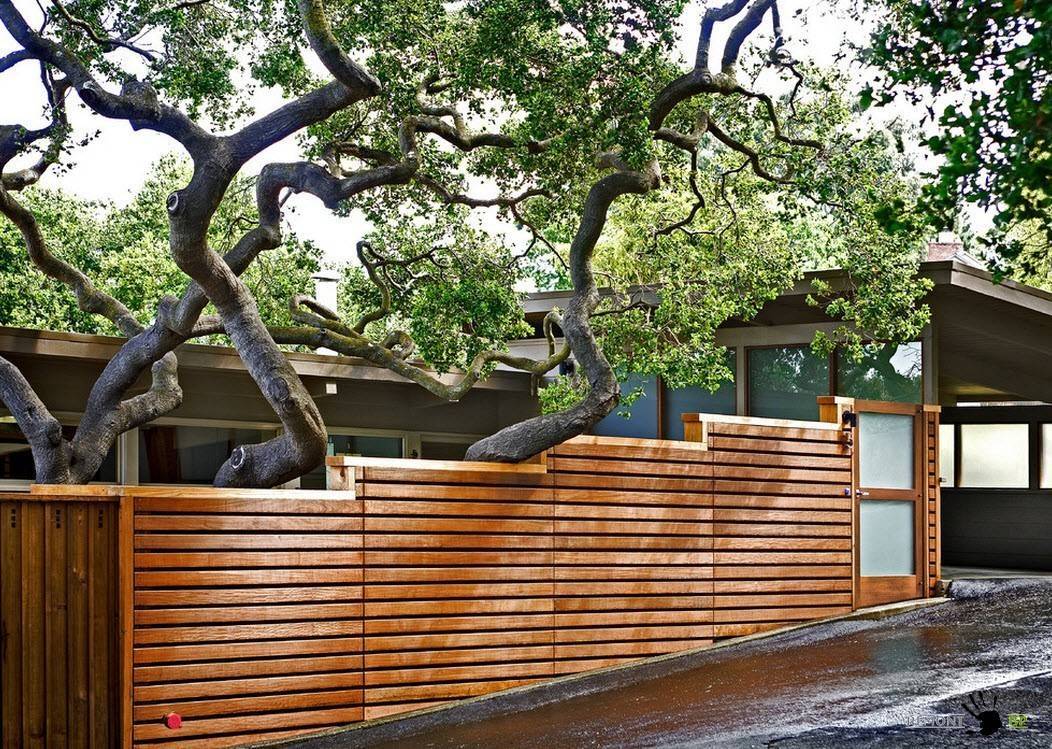 Среди деревянных сооружений особое место занимает забор-жалюзи из дерева. Внешне такое ограждение схоже с облицованной планкеном стеной. Рейки, панели или доски располагают по такому же принципу: под определённым углом лицевая сторона верхней рейки в вертикальной плоскости нависает над нижней доской.