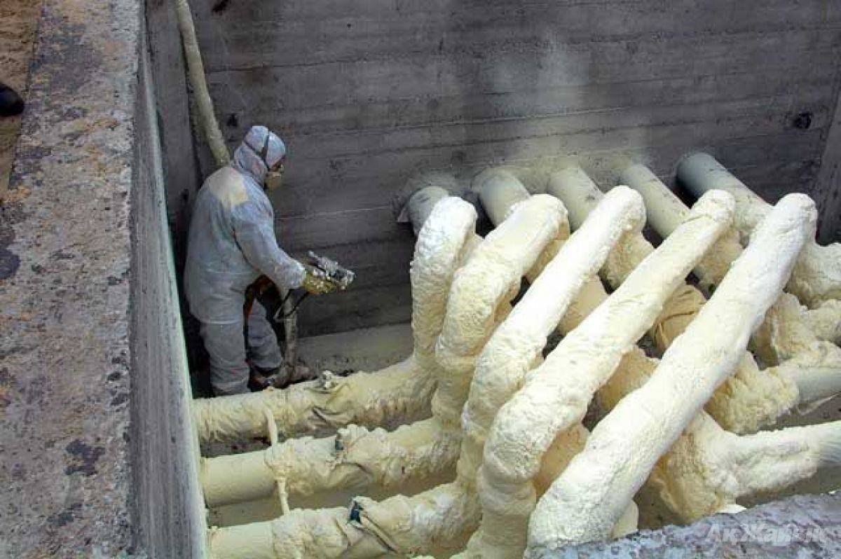 - Пенополиуретан. Если утепляемый участок имеет небольшую протяженность, то будет достаточно нескольких баллончиков. Для водопровода большой длины необходимо взять в аренду пенообразующее устройство. Трубы укладываются на подставку высотой 10 см, после чего проводится нанесение пены.